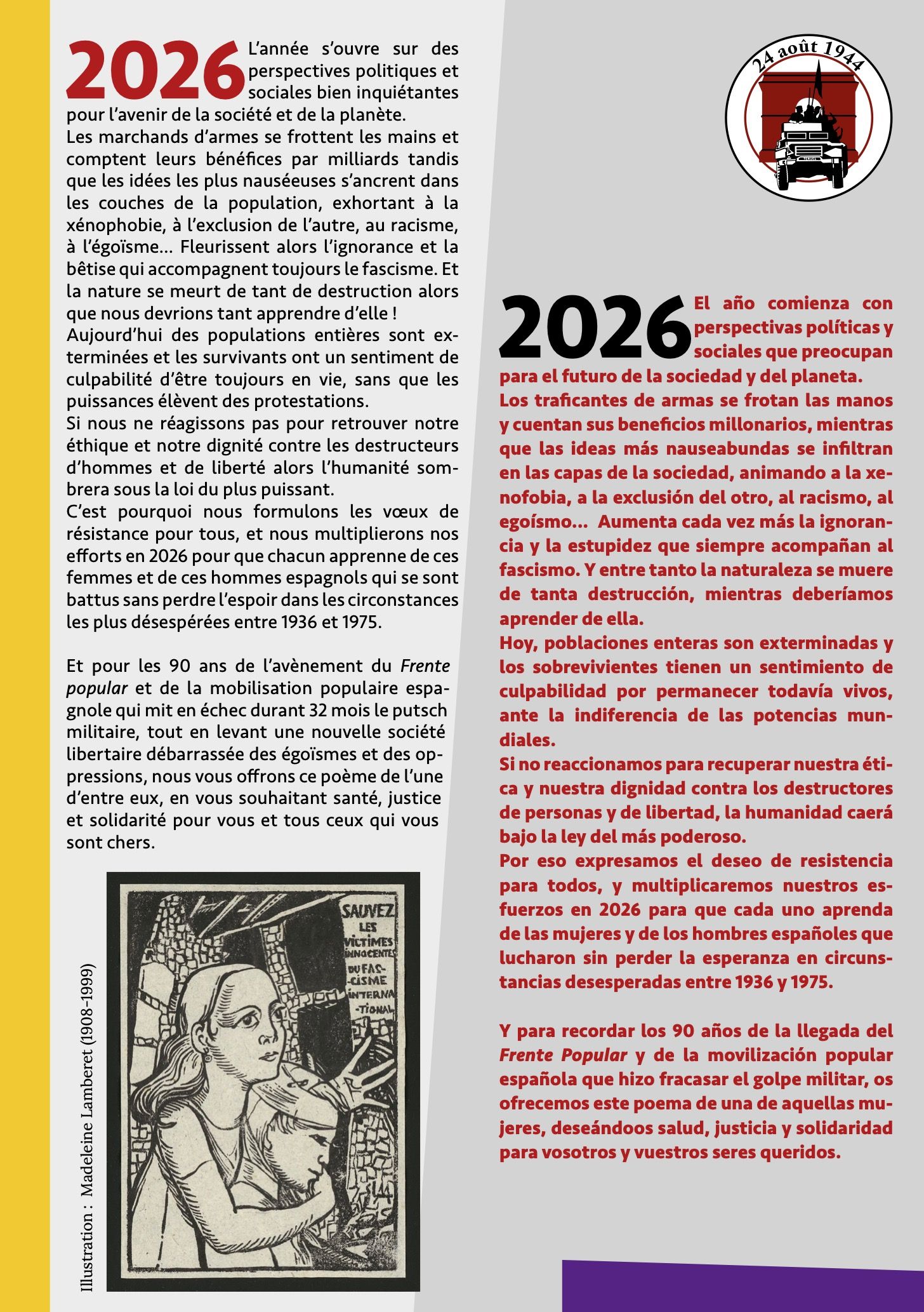 Cette association a pour but de faire connaître et de cultiver la mémoire historique (écrite, enregistrée, iconographique, artistique, etc.) de la Libération de Paris en 1944 en liant cette célébration à la participation des antifascistes espagnols de la 2e DB, en exposant toutes les facettes de cette lutte commencée le 19 juillet 1936 en Espagne, et continuée sur différents fronts en Europe et en Afrique, et plus particulièrement dans les maquis en France. Pour beaucoup de femmes et d’hommes, elle se prolongea dans le combat contre le franquisme, jusque dans les années 60.