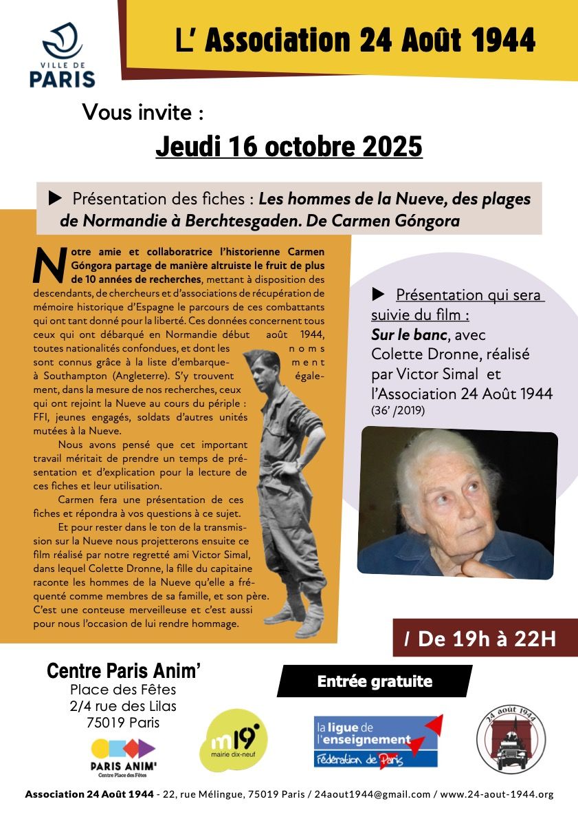 L’association 24 Août 1944 fait en sorte que leurs noms perdurent ; Carmen Góngora intégrée dans notre association, petite fille de José GÓNGORA ZUBIETA, historienne, se livre depuis de nombreuses années à des recherches auprès des institutions militaires pour retracer le parcours des hommes de la nueve quelle que soit leur nationalité ; Ce travail de fond, elle le met généreusement et gracieusement à disposition sur notre site, afin d’ouvrir très prochainement un dossier spécifique. Pas moins de 320 fiches sont présentées. Elles sont par nature à compléter. Nous ne prétendons pas tout savoir et notre souhait c’est que ces fiches soient complétées avec l’aide de celles et ceux qui comme nous travaillent à faire connaître cette histoire.