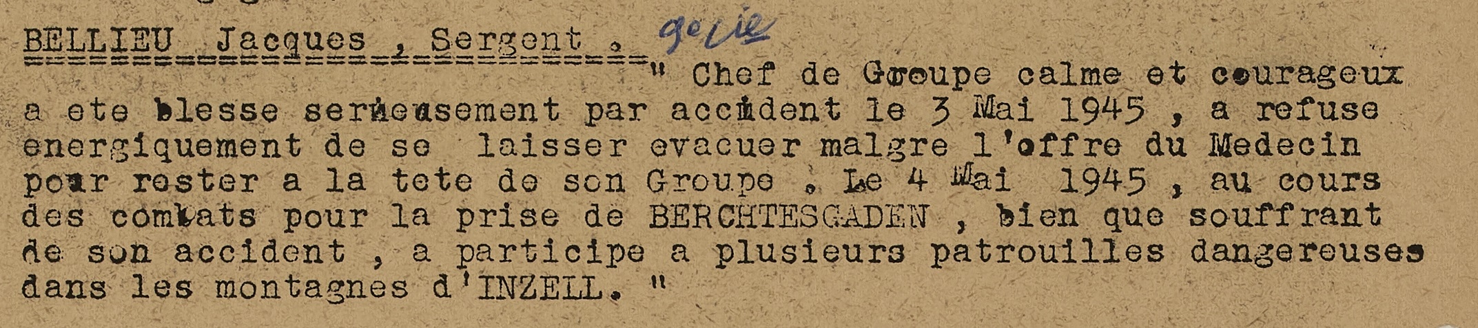 Chef de groupe calme et courageux, a été blessé sérieusement par accident le 3 mai 1945, a refusé énergiquement de se laisser évacuer malgré l’offre du Médecin pour rester à la tête de son groupe. Le 4 mai 1945, au cours des combats pour la prise de Berchtesgaden, bien que souffrant de son accident, a participé à plusieurs patrouilles dangereuses dans les montagnes d’Inzell.