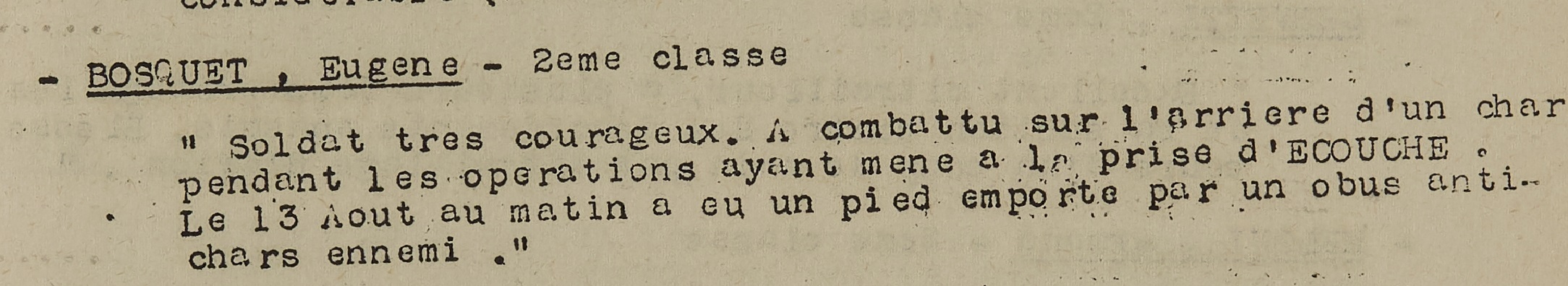 Soldat très courageux. A combattu sur l’arrière d’un char pendant les opérations ayant mené à la prise d’Ecouché. Le 13 août au matin a eu un pied emporté par un obus antichars ennemi.