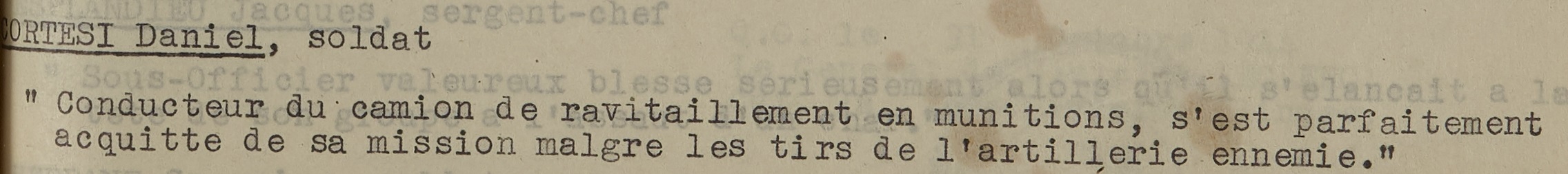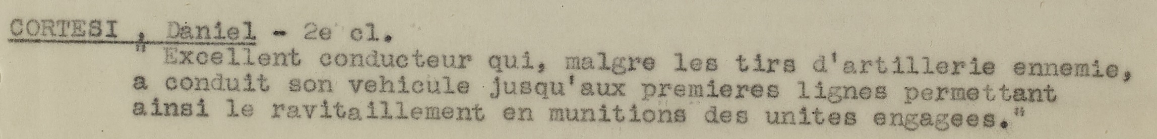 Excellent conducteur qui, malgré les tirs d’artillerie ennemie, a conduit son véhicule jusqu’aux premières lignes permettant ainsi le ravitaillement en munitions des unités engagées.