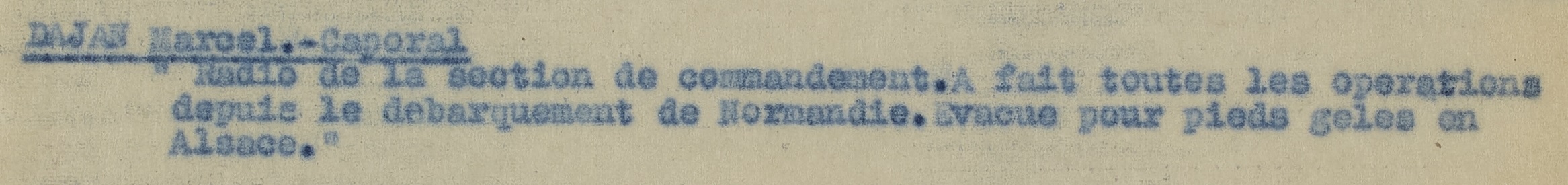 Radio de la section de commandement. A fait toute les opérations depuis le débarquement de Normandie. Évacué pour pieds gelés en Alsace.