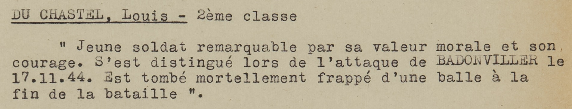 Jeune soldat remarquable par sa valeur morale et son courage. S’est distingué lors de l’attaque de Badonviller le 17.11.44. Est tombé mortellement frappé d’une balle à la fin de la bataille.