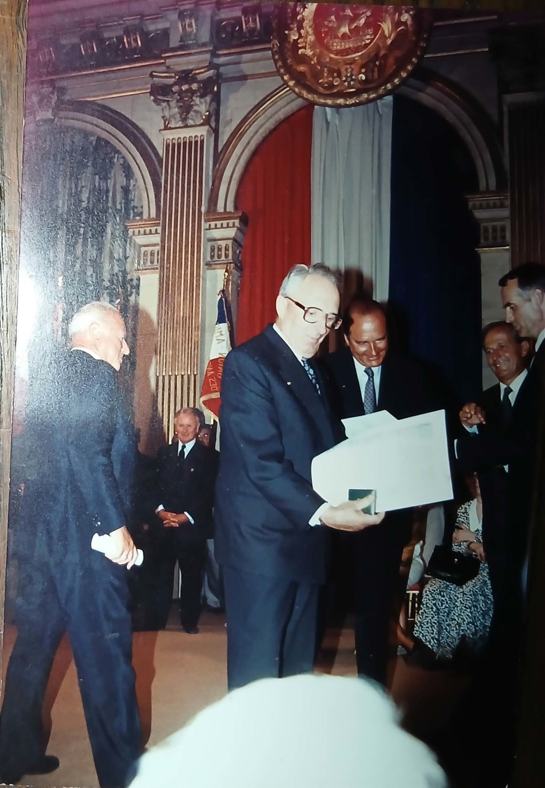 En civil : recevant la médaille de la ville de Paris des mains de Monsieur Chirac le 25 août 1990
