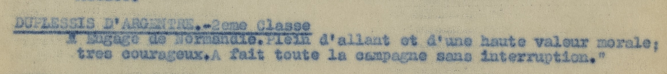 Engagé de Normandie. Plein d’allant et d’une haute valeur morale, très courageux. A fait toute la campagne sans interruption.