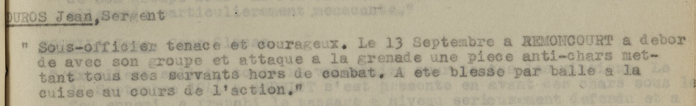 Sous-officier tenace et courageux. Le 13 septembre à Remoncourt a débordé avec son groupe et attaqué à la grenade une pièce antichars mettant tous ses servants hors de combat. A été blessé par balle à la cuisse au cours de l’action.