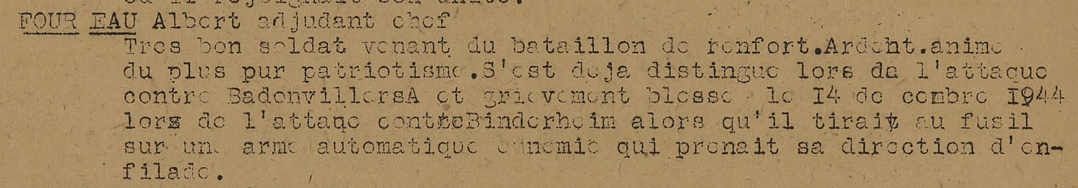 Très bon soldat venant du bataillon de renfort. Ardent, animé du plus pur patriotisme. S’est déjà distingué lors de l’attaque contre Badonviller et grièvement blessé le 14 décembre 1944 lors de l’attaque contre Bindernheim alors qu’il tirait au fils sur une arme automatique ennemie qui prenait sa direction d’enfilade.