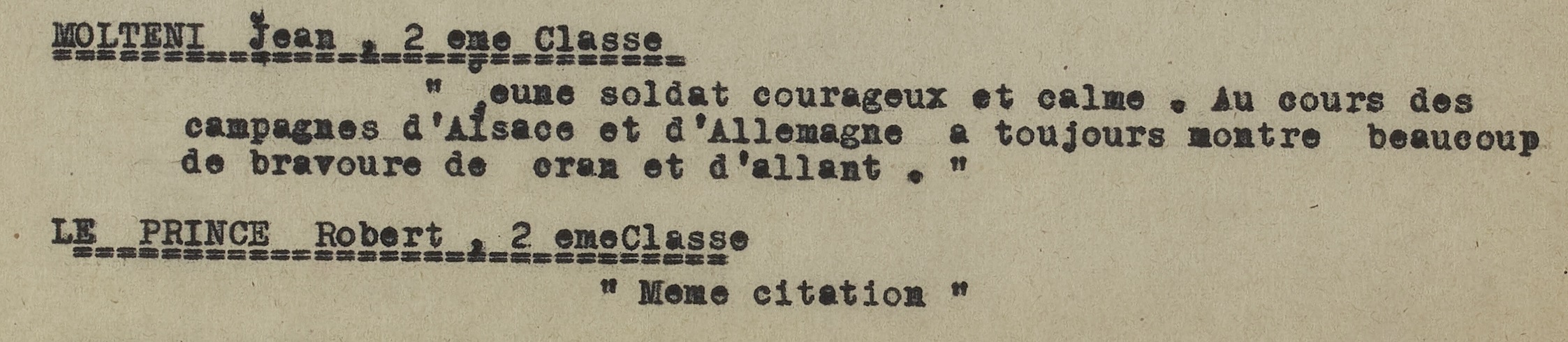 Jeune soldat courageux et calme. Au cours des campagnes d’Alsace et d’Allemagne, a toujours montré beaucoup de bravoure, de cran et d’allant.