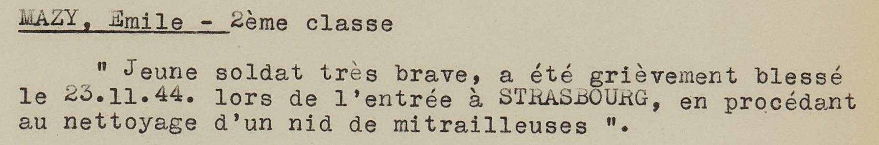 Jeune soldat très brave, a été grièvement blessé le 23.11.44 lors de l’entrée à Strasbourg, en procédant au nettoyage d’un nid de mitrailleuses.