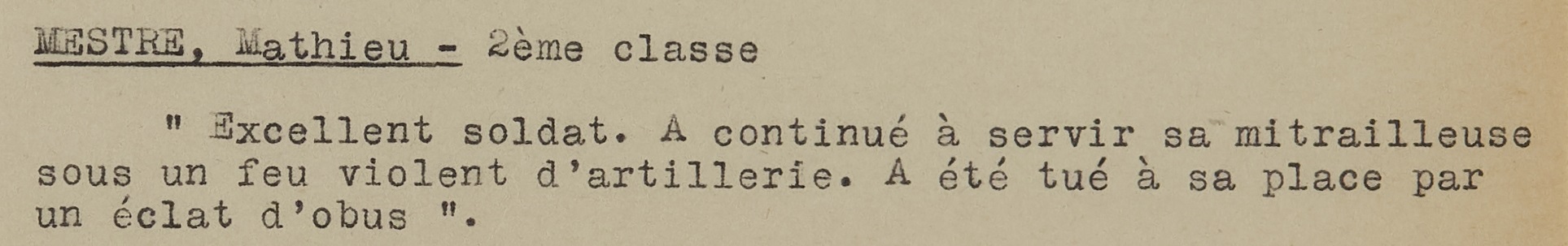 Excellent soldat. A continué à servir sa mitrailleuse sous un feu violent d’artillerie. A été tué à sa place par un éclat d’obus.