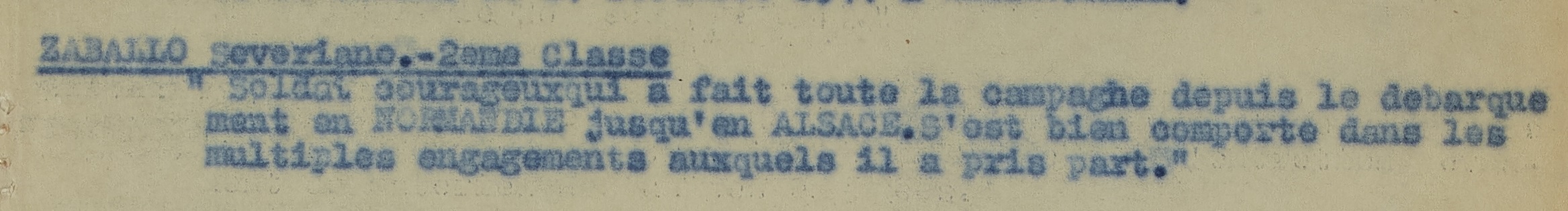 Engagé volontaire pour la durée de la guerre au Corps Franc d’Afrique (CFA) le 26/07/1943 à Alger sous le nom de ZABALLO MOLINA Severiano. Déclare être maçon
