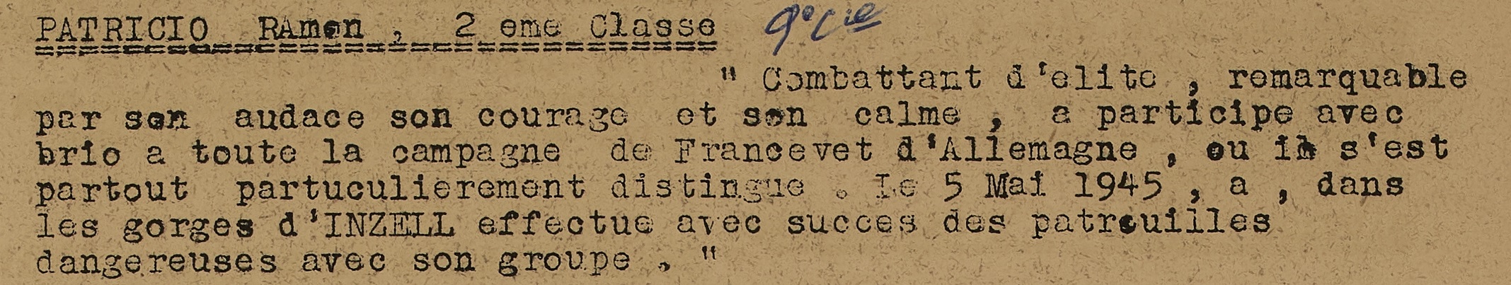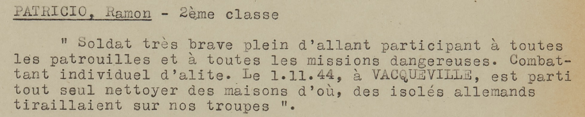 Reprend le nom de PATRICIO Ramón sous lequel il servait à la Légion Étrangère le 01/06/1944. Reprend le grade de 1ère classe auquel il a été nommé à la Légion Étrangère le même jour