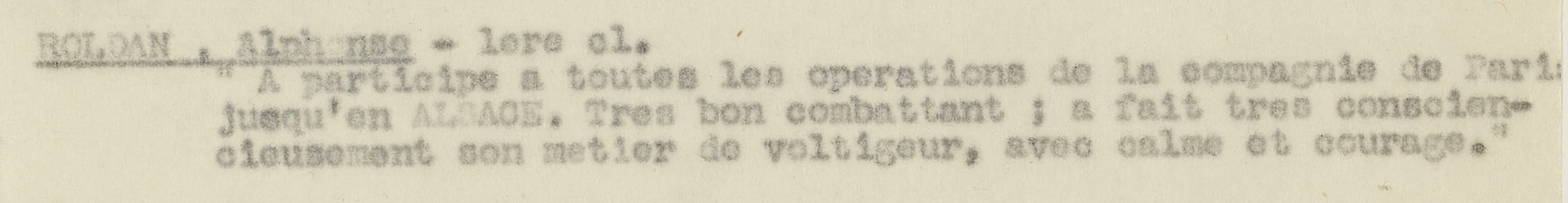 A participé à toutes les opérations de la compagnie de Paris jusqu’en Alsace. Très bon combattant ; a fait très consciencieusement son métier de voltigeur, avec calme et courage.