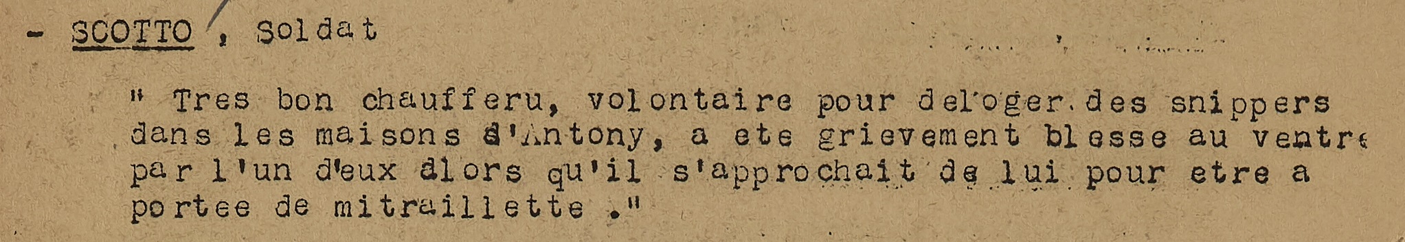 Très bon chauffeur, volontaire pour déloger des snippers dans les maisons d’Antony, a été grièvement blessé au ventre par l’un d’eux alors qu’il s’approchait de lui pour être à portée de mitraillette.