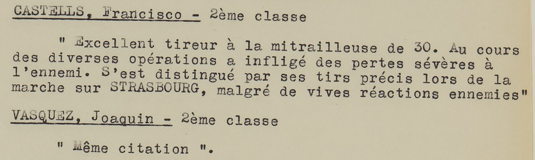 Excellent tireur à la mitrailleuse de 30. Au cours des diverses opérations a infligé des pertes sévères à l’ennemi. S’est distingué par ses tirs précis lors de la marche sur Strasbourg malgré de vives réactions ennemies.
