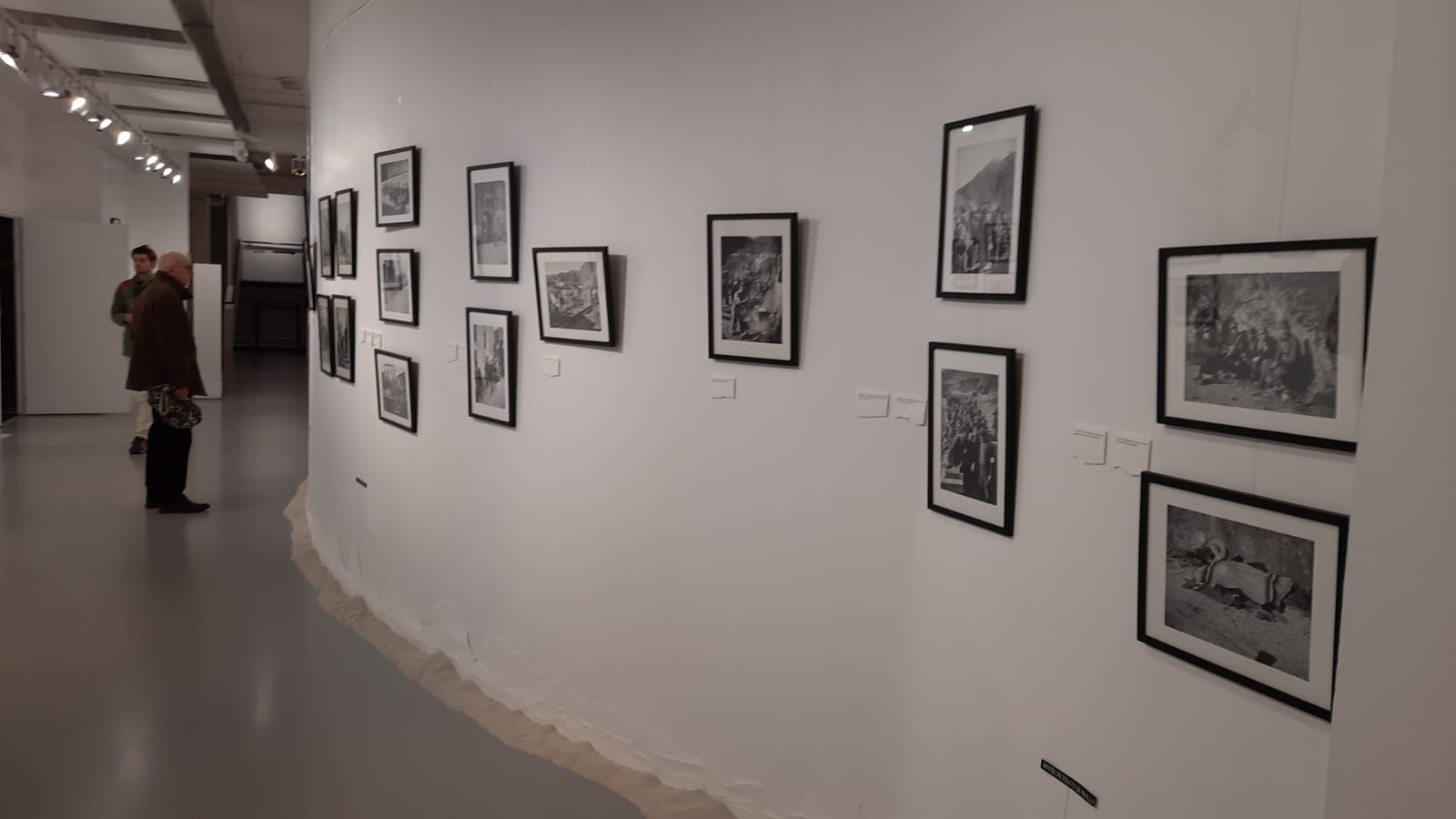 Et les rencontres ! Valentine, Maya et leur directeur d’études, Manuel. Deux jeunes diplômées de l’école d’architecture de Nantes qui ont pris en charge l’installation de l’exposition. Elles ont fait preuve d’un vrai génie scénographique avec la suggestion à la base des murs d’exposition des sommets montagneux des Pyrénées, à franchir pour se retrouver sur le sable gris des plages du Roussillon. les photos du camp d’Argelès sur Mer, posées sur un socle de lumière douce, à regarder de notre hauteur, en opposition à l’accueil plus « humain » des enfants basques en 1937 qui les entourent sur les murs de la première pièce. Ce contraste laisse des interrogations irrésolues dans la tête des visiteurs.  Des légendes au papier déchiré comme si elles avaient été notées en catimini et à la va vite sur des supports de fortune, pour ne pas oublier!  Et ce drôle de mur constellé de minuscules fenêtres noires, chacune révélant une photo ou un document pourvu que le visiteur ait la curiosité de soulever le volet qui l’obstrue. La carte de France des premiers camps ouverts, carte de notre amie Marie Rafaneau-Boz, transformée en un dessin à la craie sur tableau noir!